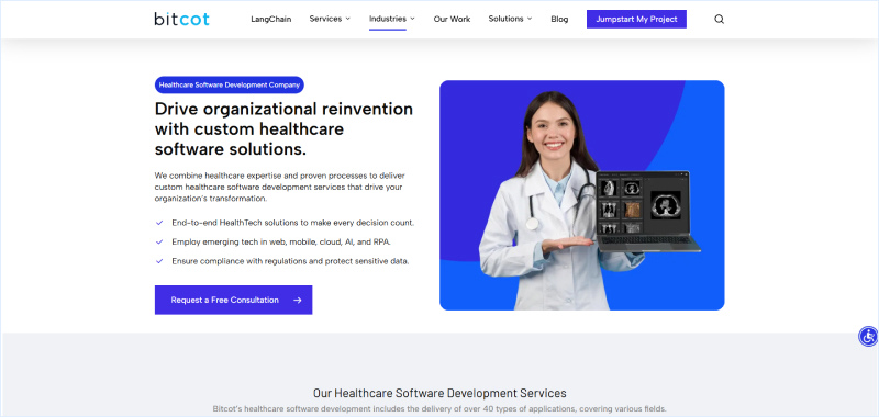 Within the healthcare sector, Bitcot develops HIPAA and GDPR-compliant patient engagement solutions, including patient portals designed to improve communication, care coordination, and service accessibility.