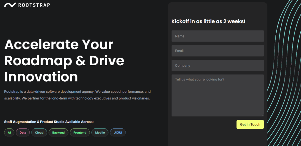 Rootstrap is a top-tier VueJS app development company that helps startups and enterprises build apps with clean code and product-focused design. Known for its user-centered, collaborative approach, this Vue.js development agency helps companies design, build, and optimize high-quality products.
