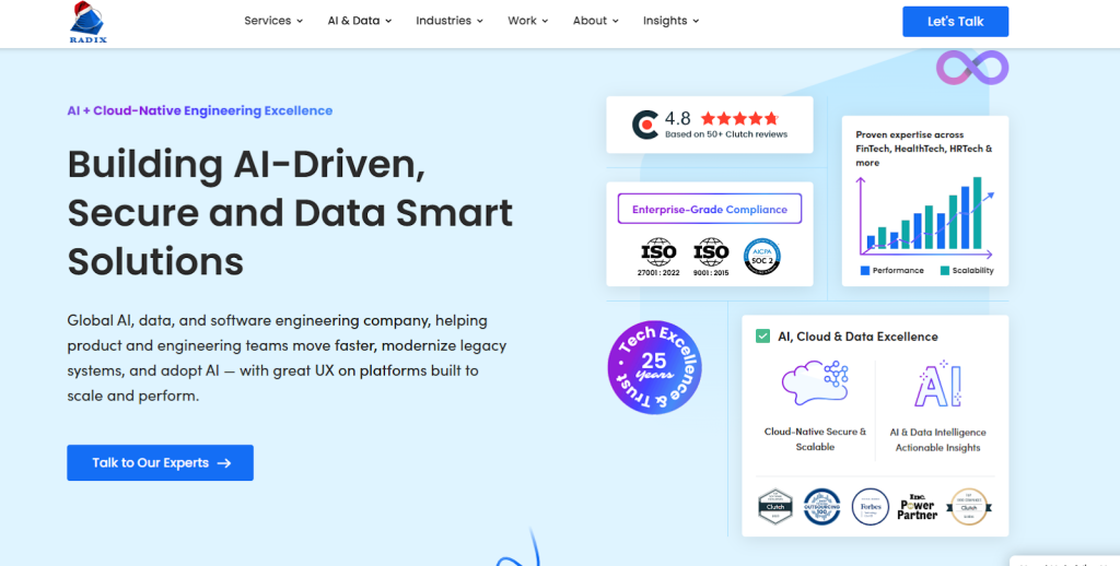 | Radixweb | $25–$49/hr | Enterprise dashboards, scalable architecture, long-term maintenance | Frisco, TX |